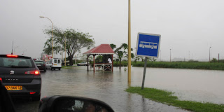 Il a plu toute la nuit. C'est très humide encore au lever ce matin.  Mais nous avions décidé de visiter le nord de l'île. Nous ne renonçons pas ; la pluie non plus qui organise bientôt le ballet des essuie-glace tandis que les flaques s'exposent partout jusque dans le golf. A Rivière Salée nous tombons sur un bouchon.  On avait été prévenu : la circulation n'est pas fluide sur l'île.